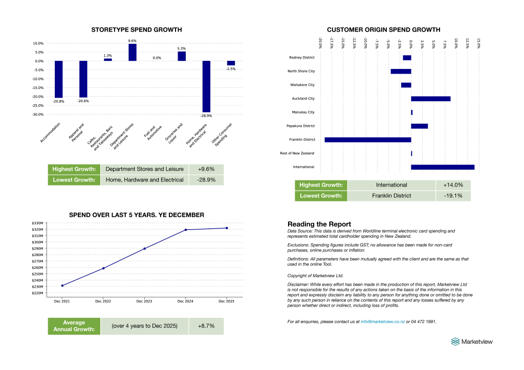 December spending in Warkworth totalled $33.7m, a 0.6% dip on last year, with 478,000 transactions down 2.1%. This was a slightly better result than the wider Auckland region for spend, and similar on transactions. The busiest day was Tuesday, 23 December ($2.3m), just before Christmas Day. Category trends were mixed: Department Stores and Leisure grew 9.6%, whereas Home, Hardware and Electrical fell 28.9%. Over the past 12 months, local spend is up 0.9% and transactions are down 0.6%. International visitors continued to help, with international spend up 14.0%. For charts and the full breakdown, see the Marketview report HERE>