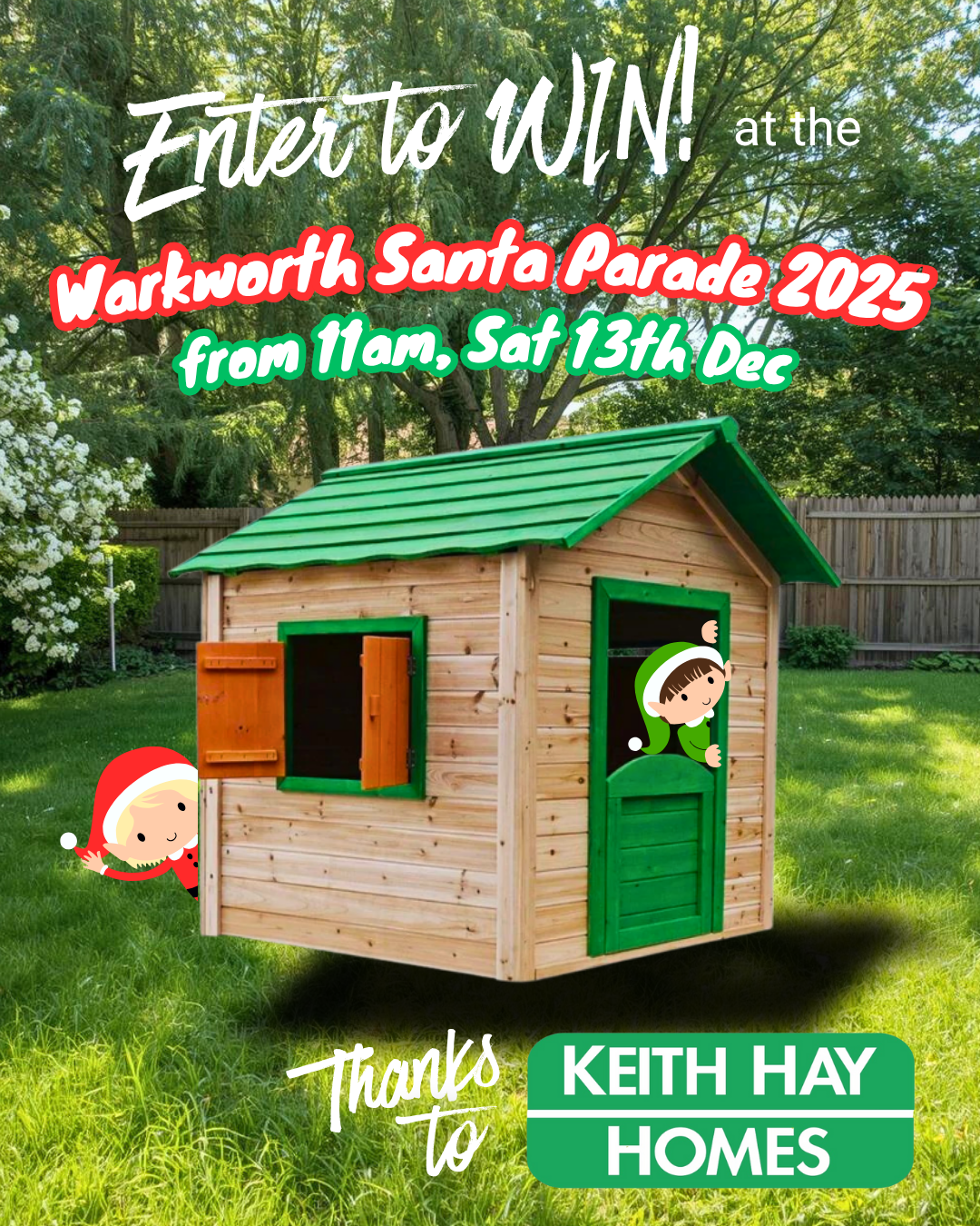A brand new cubby house could be heading home with one lucky family at the Warkworth Santa Parade 2025, thanks to Keith Hay Homes Warkworth!